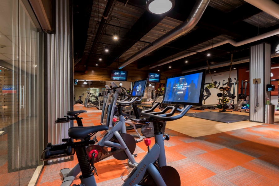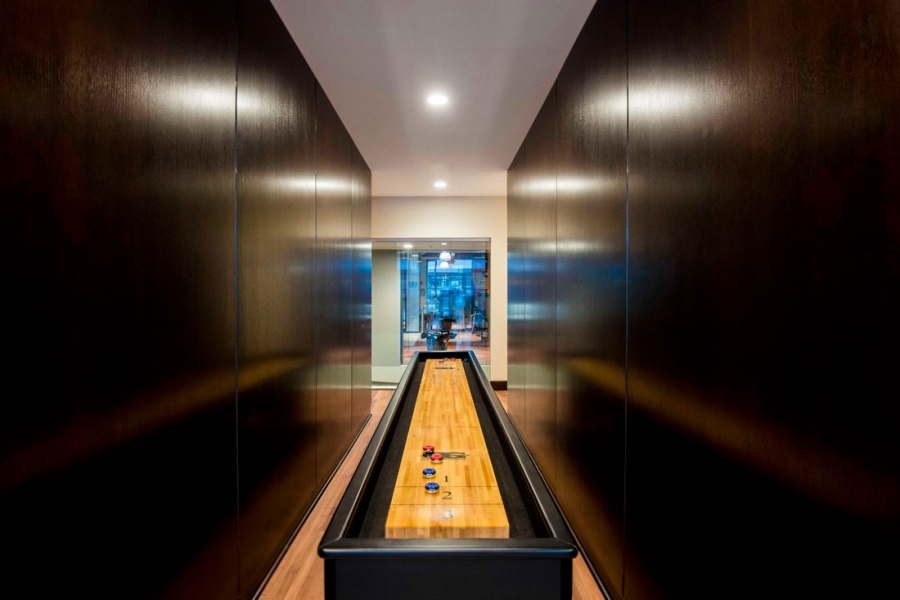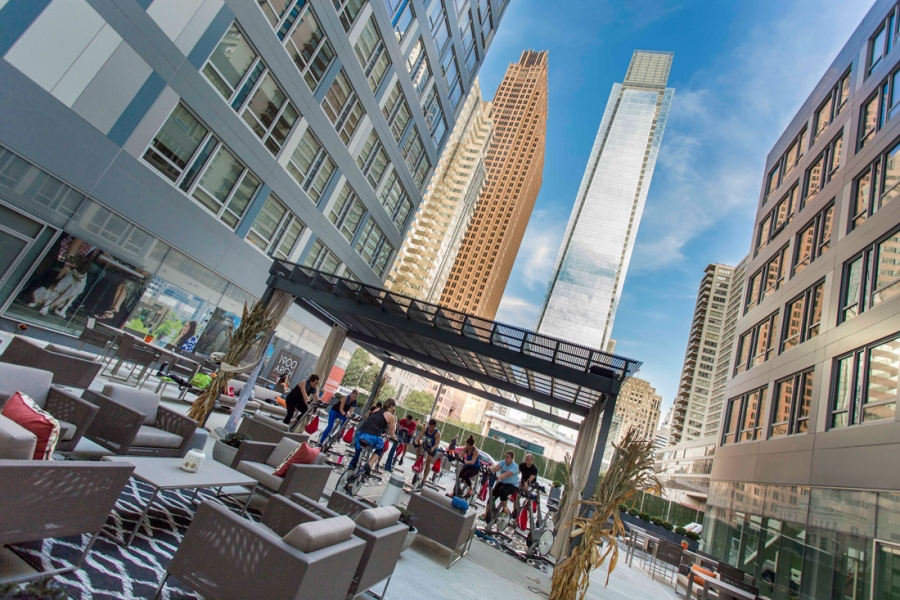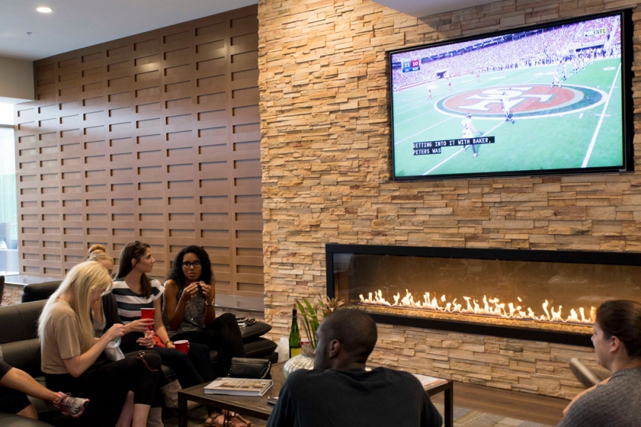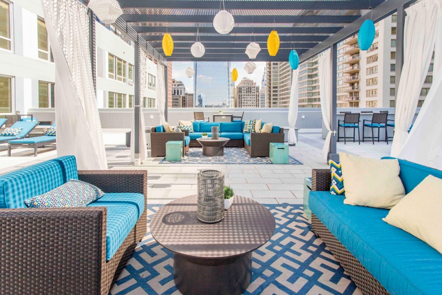 Amenities: State-of-the-art fitness center; WiFi-enabled entertainment lounge with gas fireplace; private parking garage; sky deck; courtyard with fire pits; green roofs