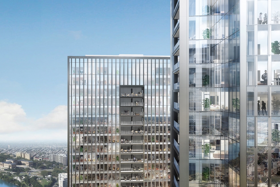 While these dynamic buildings were designed with cohesion in mind, they stand at different heights with subtle differences in the angle of the building placement and texture of their skins, causing the reflection of the sun to give each a unique appearance. The 28-story tower at 60 N. 23rd Street houses most of the shared activity-oriented rooftop amenities, including terraces, a luxurious infinity pool, lounge, and state-of-the-art fitness center, as well as on-site parking and more than 72,000 sf of ground-floor retail space — including a flagship two-story, 65,000-sf Giant supermarket. One of the largest grocery stores in Center City, this groundbreaking retail outlet will feature online shopping and delivery service, plus an outdoor terrace where shoppers can dine, enjoy live music, or host private events.